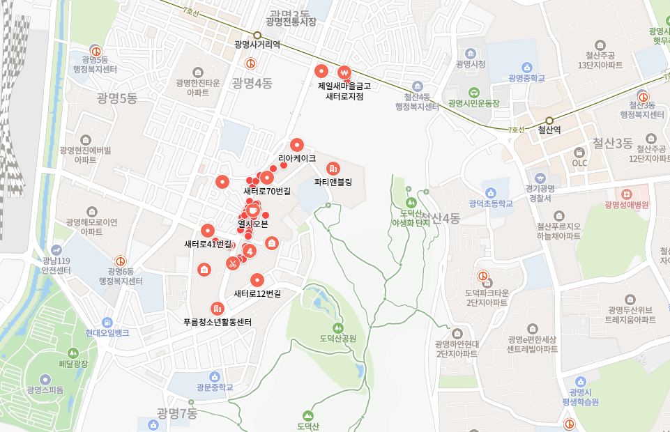 광명동 새터로는 7호선 광명사거리역과 지척에 위치하고 있으며, 인근에 초, 중, 고등학교가 위치하고 있으며, 도덕산공원과 가까운 지역에 위치하고 있는 주거지역이다.