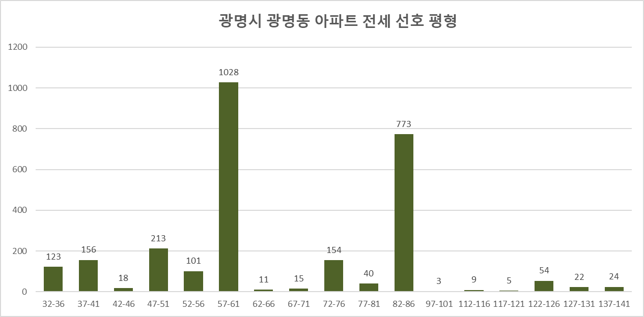 2023년 이후 누적 전세거래량에서 경기도 광명시 광명동의 선호하는 아파트 전세는 전용 59 타입의 아파트가 전용 84타 입보다 다수를 차지하는 기 현상을 보인다. 이는 이 지역에 거주하는 "젊은 층"이 많음을 의미하는 것일 수 있다. 또한 그 젊은 층에서 2세대 1 가구보다는 1세대 1 가구로 자녀가 없는 아파트 전세 거주자가 다수일 가능성이 높다.