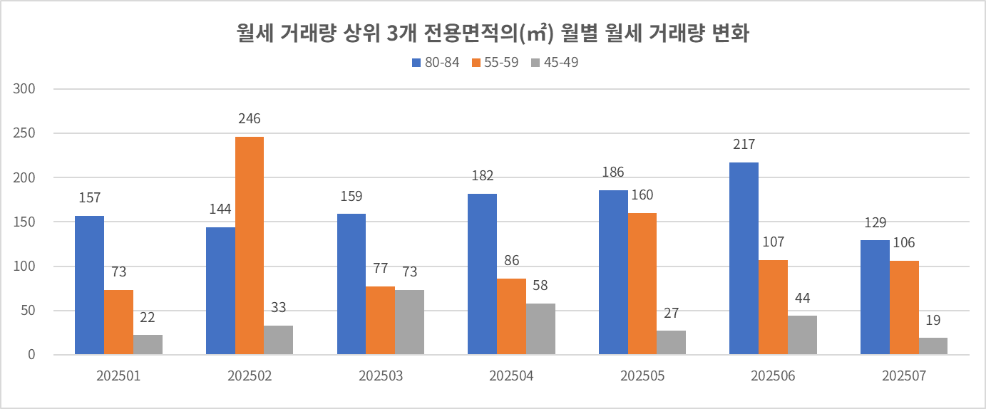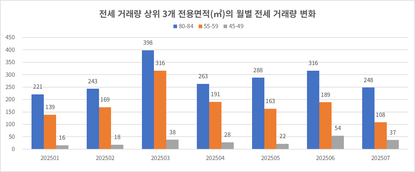 * 2025년 누적 전세 거래량 상위 3개 평형에서 압도적으로 많은 거래량은 전용 84㎡ 타입이 속한 면적대.